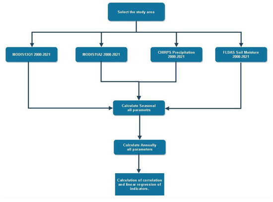 In this study, LST-Day variability in Afghanistan was investigated for the period 2000–2021, and the impact of such factors as soil moisture, precipitation, and vegetation coverage on LST was assessed using regression methods. The summary of the sources of the remote sensing data used in this study is provided in Table 1, while the flowchart of data processing is presented in Figure 2. All satellite-born statistics of the surfaces belong to the bright days (hours) only.