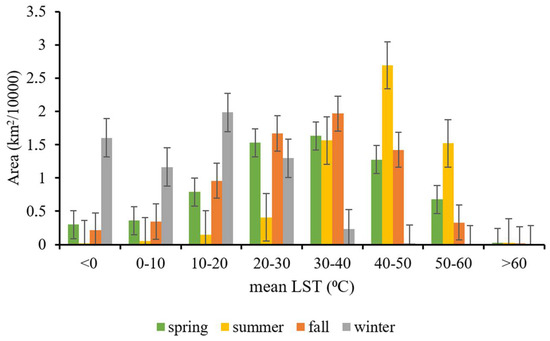 Figure 3 shows the seasonal variations of Afghanistan’s LST during the study period. The warmest season was summer, whereas the coldest season was winter. In the spring and fall, the LST was moderate. In the winter, 44% of the area (276,824.14 ± 38,814 km2) had an LST lower than 10 °C, and 56% of the area (351,962 ± 82,195 km2) had an LST between 10 and 50 °C. In the spring, 10% of the area (65,965 ± 58,683 km2) had an LST lesser than 10 °C, 79% of the area (522,384 ± 107,829 km2) had an LST between 10 and 50 °C, and 11% of the area (70,361 ± 56,145 km2) had an LST above 50 °C. In the summer, 0.9% (5890 ± 50,921 km2) of the study area had an LST less than 10 °C, 75% (482,343 ± 174,833 km2) of the study area had LST between 10 and 50 °C, and about 24.1% (154,923 ± 68,754 km2) of the study area had an LST higher than 50 °C. In the fall, 8.1% of the area (55,858.96 ± 60,718 km2) had an LST lower than 10 °C, 87.1% of the area (601,843 ± 154,506 km2) had an LST between 10 and 50 °C, and 4.8% (33,220 ± 63,788 km2) of the area had an LST higher than 50 °C.
