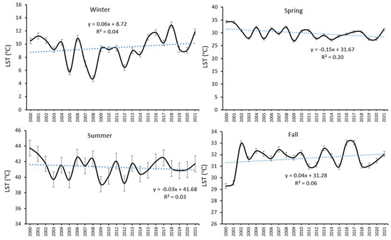 In Figure 5, the mean seasonal variations of LST during the study period are presented. In the winter, the highest LST was observed in 2018 (12.91 ± 0.73 °C), while the lowest was in 2008 (4.7 ± 0.79 °C). In the spring, the highest LST values were in 2000 and 2001 (34.37 ± 0.94 and 34.12 ± 0.88 °C, respectively), and the lowest values were observed in 2003, 2005, 2014, 2019, and 2020 (27.87 ± 0.44, 27.68 ± 0.48, 27.27 ± 0.57, 27.54 ± 0.51, 27.60 ± 0.5 °C, respectively). In the summer, the highest LST was in 2000 (43.74 ± 1.04 °C). However, the errors in the LST estimation indicate that it should be treated the same as the values for 2001, 2006, 2008, 2011, 2013, 2016, 2017, and 2021. The lowest summer LST was in 2009 (39.1 ± 1.03 °C), but it is indistinguishable from the values for 2003, 2005, 2010, 2012, 2014, and 2019. In the fall, the highest LSTs were in 2002, 2016, and 2017 (32.97 ± 0.27, 33.03 ± 0.28, 33.05 ± 0.29 °C, respectively) and the lowest in 2000 and 2001 (29.28 ± 0.5, and 29.55 ± 0.4 °C, respectively). The trend lines fitted to the seasonal time series of LST indicate that the LST went up by 0.063 °C/year in the winter and by 0.035 °C/year in the fall, while it decreased by 0.14 °C/year in the spring and 0.03 °C/year in the summer.