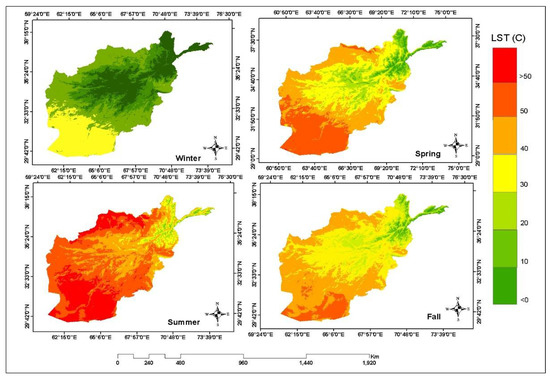 The maps of the seasonal mean LST in Afghanistan in the period 2000–2021.