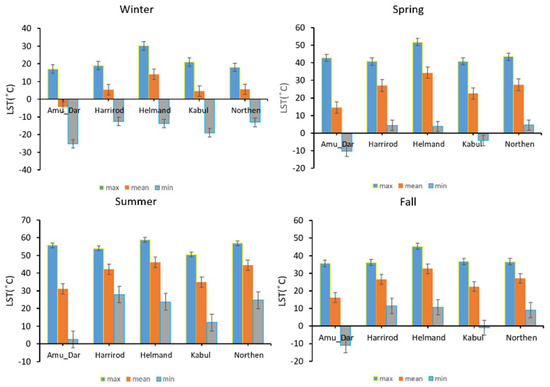 The maximum, minimum, and mean seasonal LST of Afghanistan’s basins in the period 2000–2021.