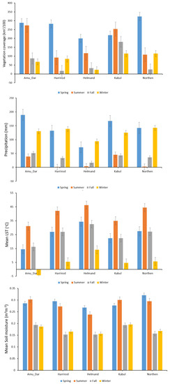 The seasonal averages of LST, precipitation, soil moisture, and vegetation coverage in Afghanistan’s basins in the period 2000–2021.