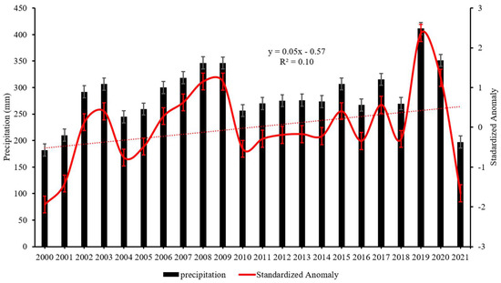 Figure 9 shows the changes in the mean annual precipitation in the study area over 22 years. The trend line indicates that in the study area, the yearly precipitation sum slightly increased with subsequent years. The highest precipitation was observed for 2008, 2009, 2019, and 2020, with sums of 346.6 (±13.04), 346.4 (±13.02), 411.33 (±16.8), and 351.42 (±14) mm, respectively. The lowest precipitation sums were observed for 2000, 2001, and 2021, with sums of 182 (±22), 210 (±16), and 197 (±18.7) mm, respectively. A brief look at the LST and precipitation anomalies (Figure 4 and Figure 9) suggests that they should be negatively correlated, which indicates that the precipitation parameter was one of the factors affecting the LST.