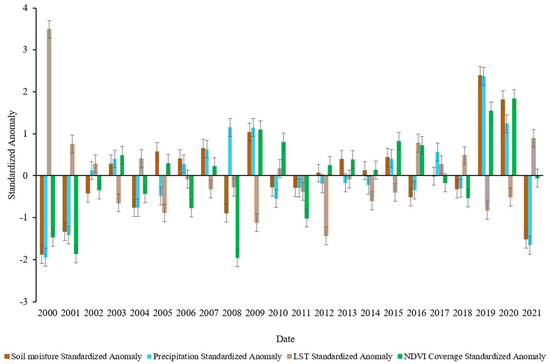 In Figure 11, the variations of annual anomalies of LST, precipitation, soil moisture, and vegetation coverage are presented. In 2000, 2001, and 2021 the highest LST and the lowest vegetation coverage, precipitation, and soil moisture were observed simultaneously, while in 2012 and 2019, the lowest LST was followed by the highest vegetation coverage, precipitation, and soil moisture.