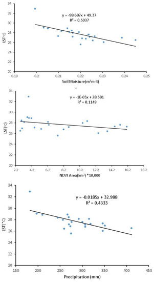In Table 2 and Figure 13, the relationships between LST, precipitation, soil moisture, and vegetation coverage obtained employing the linear regression are presented. They were obtained for annual country-wide means. It can be concluded that the relationships between LST and soil moisture and precipitation were significant, high, and negative (R = −0.79, and R = −0.635, respectively), which means that the increase in soil moisture or precipitation caused a decrease in LST. LST was also anticorrelated with vegetation coverage (R = −0.337); however, this relation was statistically insignificant. Soil moisture had the highest impact on LST variability, and vegetation coverage had the lowest impact on LST changes.