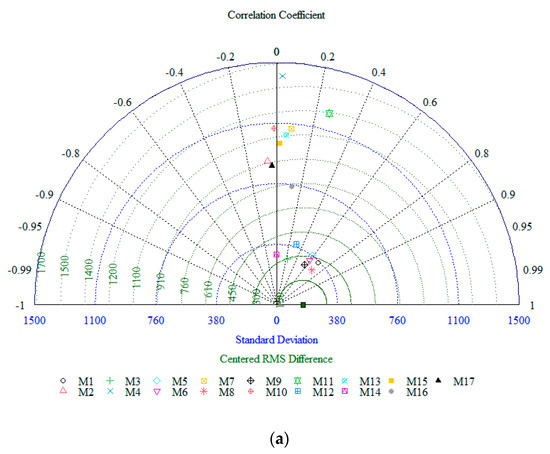 In the grid-based comparison, station-based observed rainfall data were subjected to three different spatially interpolation techniques (IDW, OK, and EBK). Among them, EBK showed a relatively good interpolation skill to map the spatial distribution of rainfall in the study area (Table S2) and thus its result has been considered as a reference data for spatial rainfall analysis and comparison of the climate model rainfall projection performance. The grid-based comparison results depicted in Figure 3a show the individual climate model’s performance in capturing the spatial variability of rainfall in the region. The results indicated a considerable difference in climate model performance. Among all candidates, M8 was the best-performing individual climate model with a value of 0.7 and 225 mm, for pattern correlation coefficient and RMSE respectively, and with the closest standard deviation value (285 mm) compared to observed data (nearly 175 mm). The next best-performing climate model was M9, followed by M1, M6, M3, and M5. M4, M11, M10, M7, M13, M15, M2, and M17 showed the poorest skill in capturing the spatial pattern. Some climate models such as M2 have a negative spatial pattern correlation (nearly −0.1) with observed data. Whereas M4 provided an exaggerated spatial variability with a value of 1450 mm compared to the observed value of 175 mm.