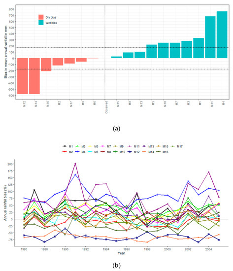 In this section, basin-level comparison results that include basin average mean annual rainfall, inter, and intra-annual rainfall variability are presented, and the results are depicted in Figure 4a–c respectively. As the results in Figure 4a show, the majority of climate models overestimated the basin average mean annual rainfall while others presented an underestimated amount. M4 (760 mm), M11 (679 mm), and M1 (329 mm) have the highest overestimated rainfall while M14 and M12 provide the highest underestimated rainfall with a bias of roughly −582 mm rainfall each. The discrepancy between models’ results indicates the magnitude of uncertainties in rainfall projection from CORDEX climate models. For instance, considering the bias from the two extreme models (M4 and M12), leads to a difference of around 1342 mm rainfall amount per year. This discrepancy in annual rainfall is even higher than the maximum observed rainfall amount in the region. Among all the climate models, M6 has the least biases with only −1.2 mm followed by M15 (29.5 mm), M9 (−55.5 mm), and M8 (94.3 mm). Reports from [8,28] also showed a large positive bias by RCMs in the East Africa region and Ethiopian highlands respectively, which supported the finding of this study. Ref. [55] compared two GCMs and their dynamically downscaled version from CORDEX over Africa and reported wet bias in the Ethiopian highlands and elevated terrains of Sudan. Other studies by [50,56] conducted CMIP5 GCMs performance evaluation over East Africa and the Great Horn of Africa respectively and reported overestimation of basin average rainfall amount by most of the CMIP5 GCMs and their ensembles.