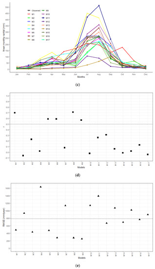 The six criteria that have been used to select candidate climate models for new ensemble formation were the bias in basin average rainfall, bias in annual average rainfall, bias in monthly average rainfall, the correlation coefficient (r), RMSE, and StE in the spatial rainfall pattern. In climate modelling, in particular rainfall projection, the two fundamental aspects that every climate model is expected to address are: when the rain comes (the time) and where the rain falls (the place). Thus, the intra-annual (seasonal rainfall pattern) and the inter-annual rainfall result account for model skill in capturing the temporal variability of rainfall. The result of each climate model in each of these metrics is given in Figure 4d–f respectively and the summary numeric result derived from these figures is provided in Table 3. The last three metrics were derived from grid-series data, and they reflect the model’s skill in capturing the spatial distribution of rainfall.