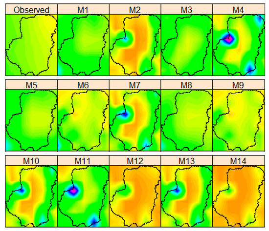 The inter-annual rainfall variability (1985–2005) from the CORDEX models is given in Figure 4b. The result showed a wide range of model performance from a continuous underestimation for instance by M12 and M14 to a continuous overestimation over the entire period by M4 and M11. Despite the difference between individuals’ model bias, there is a high tendency to overestimate annual rainfall from most of the climate models. M6, M8, and M9 appeared to be relatively best-performing models with less bias in simulating the inter-annual rainfall variation though they still have sudden fluctuations in their prediction results. A similar study by [4] over the Africa domain reports the poor performance of CORDEX-RCMs in simulating the inter-annual variability of rainfall in the Ethiopian highlands, which is more or less in line with the result of this study.