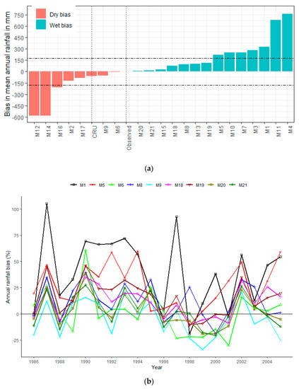 Ref. [18] reported that climate models sometimes could provide a more faithful result to some climate quantities better than the reanalysis dataset, which indicates the improvement in modern climate models. Findings from [8] also show that rainfall biases of reanalysis can be as large as the bias from RCMs. In the interest of seeing such a possible scenario, the current study attempted to evaluate the performance of CRU rainfall data together with all the climate models at the basin level and the result of bias in basin average rainfall is given in Figure 9a. As the result revealed, CRU data underestimated the mean annual rainfall by nearly 56 mm. From this result, there are six candidate climate models (M6, M20, M21, and M15) that have shown better agreement with observed data than CRU data, yet this dataset has been used as a reference in several climate model evaluations research works. For instance, if the best model were to be chosen using the bias in basin average rainfall and CRU data as a reference, then M9 would have been the best model with a little magnitude of bias compared to CRU and probably followed by M17. This result clearly shows how uncertain the model evaluation could be if appropriate reference datasets were not used. [21] also reported a shift in the rank of candidate models when evaluated under different reference datasets which are in support of the finding in this research. The outperforming result of some climate models over the CRU reanalysis dataset in some stations is also in line with the report of [8] where RCMs were found to have a better simulation result than the ERA-Interim reanalysis dataset in Africa’s climate.