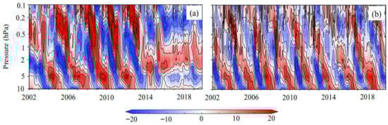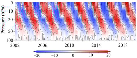 Time–height cross-section of zonal–mean-zonal wind anomalies (ms−1) averaged between 10° S and 10° N in the tropical stratosphere (100–5 hPa) for the control run from 2002 to 2019. Contours interval is 5 ms−1.