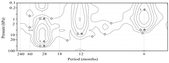 Figure 2 depicts the power spectrum of the zonal–mean-zonal wind averaged between 10° S and 10° N in the tropical stratosphere and mesosphere (100–0.1 hPa), which shows that the stratospheric QBO gradually diminishes with altitude in the upper stratosphere minimizing in the lower mesosphere. On the other hand, the annual cycle and the semiannual oscillation (SAO) become dominant in the upper stratosphere and mesosphere.