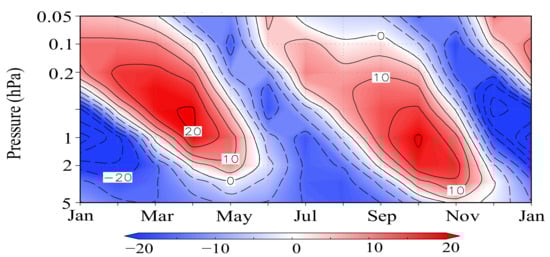 Figure 1 displays the time–height cross-section of zonal–mean-zonal wind anomalies averaged between 10° S and 10° N in the tropical stratosphere (100–5 hPa) for the control run for about 20 years. Anomalies mean the deviations from the annual cycle, i.e., the climatological monthly value is subtracted from an average for each month. The control run simulated a QBO for about a 30-month period and maximum amplitude at 20 hPa of about 18 ms−1 with steeper westerly shear (∂U/∂z > 0) than easterly shear (∂U/∂z < 0), and these features approximately agree with observations [,]. Compared to the QBO simulated under time-evolving forcings of the REF-B2 scenario, the maximum amplitude at 20 hPa is nearly the same, but the period is slightly longer by about two months [].