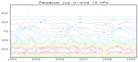 Time–latitude cross-section of zonal–mean-zonal wind (ms−1) at 10 hPa in the upper stratosphere for the perpetual July run. Contours interval is 10 ms−1.