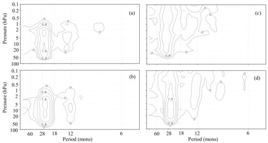 Figure 7 exhibits the power spectrum of zonal–mean-zonal wind from 100 to 0.1 hPa, averaged between 10° S and 10° N for the four perpetual runs. The power spectrum in the period ranges from about 20 to 40 months corresponding to the QBO power. It is natural that the four perpetual runs did not simulate the SAO in the mesosphere, because one of the driving forces of the SAO stems from the semiannual meridional flow across the equator between the two hemispheres (e.g., [,]), which did not exist in the perpetual runs. The QBO power spectrum is similar among the three perpetual runs (January, July, and October) below the stratopause though there are slight differences for the center periods as stated above. Compared to these three perpetual runs, the QBO power in the perpetual April run is much smaller in the stratosphere.