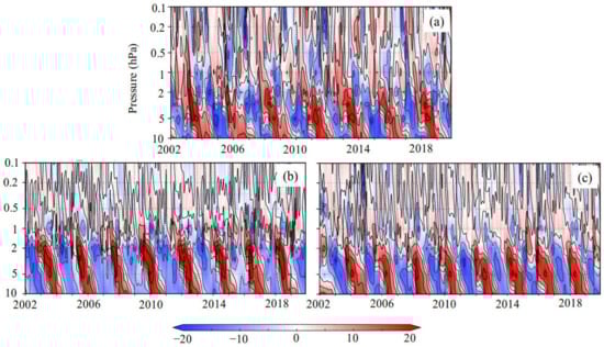 Figure 3 exhibits the time–height cross-section of the annual cycle of zonal–mean-zonal wind averaged between 10° S and 10° N in the tropical upper stratosphere and mesosphere (5–0.05 hPa) for the control run, in which the SAO is much more prominent than the annual component. The simulated SAO reproduced the observed features such that the first cycle beginning with the stratopause easterly phase in northern winter is larger than the second cycle beginning with the stratopause easterly phase in southern winter (e.g., []). The simulated SAO amplitudes of the first and second cycles are similar magnitudes to those in the reanalysis data in the lower mesosphere and stratosphere, respectively, while they are much smaller than those in satellite data in the middle and upper mesosphere [,].