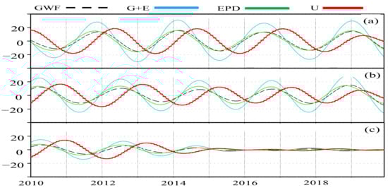 In this section, the forcing of the QBO is investigated with a focus on the circumstances, in which the QBO disappeared after about 5 cycles in the perpetual April run. The driving forces of the QBO in the MRI-CCM are largely due to parameterized gravity waves launched at the lowest level [] and resolved waves propagating from the troposphere. The parameterized gravity-wave forcing is referred to as gravity-wave forcing (GWF), and the resolved wave forcing is represented by the Eliassen–Palm flux divergence (EPD). Of these two forcings, GWF plays a more crucial role in reproducing the QBO in the MRI-CCM, because there appeared no QBO without GWF. Figure 10 shows the time series of the QBO components of zonal–mean-zonal wind, EPD, GWF, and combined forcing (EPD + GWF) at 20 hPa for the control run, the perpetual runs of January, and April from 2010 to 2019, in which a band-pass Lanczos filter [] was applied to derive the QBO components defined as those between a 20- and 40-month period.