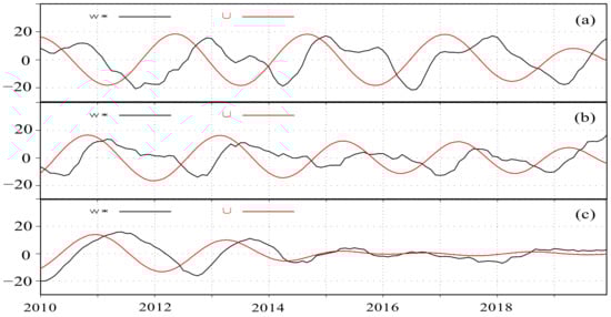 While the QBO components were recurring without suspension in the forcings and zonal wind, with some variations both in the control run and the perpetual January run, both EPD and GWF began to decline around 2012, prior to the weakening of zonal wind after 2013, in the perpetual April run. Decline of the vertical velocity QBO also may well be seen following the weakening of zonal wind QBO. Figure 11 shows the residual mean vertical velocity anomalies and zonal–mean-zonal wind at 20 hPa for the control run, the perpetual runs of January, and April from 2010 to 2019. The vertical velocity QBO is retarded by about a quarter cycle to zonal wind QBO [,] for the three runs, implicitly indicating that the decline of the vertical velocity QBO after about 2013 in the perpetual April run is not a cause but a result of the weakening of zonal wind.