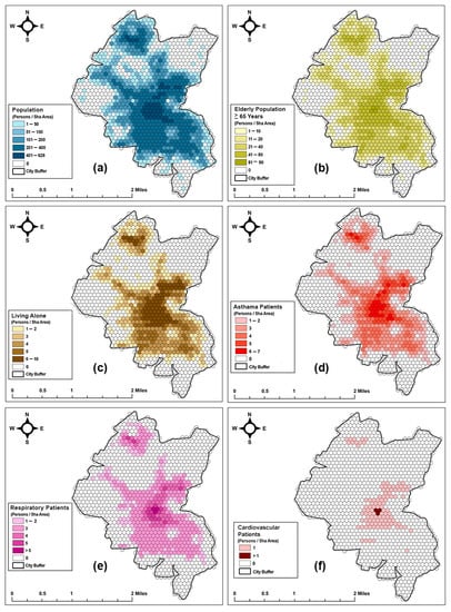 (a) Total population in the city; (b) elderly population ≥65 years; (c) those living alone; (d) asthma patients; (e) patients with other respiratory diseases; (f) cardiovascular patients.