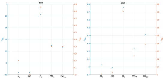Correlation coefficient (α) of monitored air temperature (Ta) and surface temperature (Ts) with air pollutants during summer season (July and August) of 2019 and 2020 (data source ATMO France).