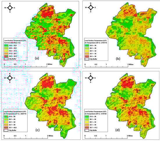 Land surface temperature maps: (a) summer mean 2020; (b) 27 July 2018; (c) 25 July 2019; (d) 31 July 2020. Note: The summer mean temperature is the mean LST of July and August 2020.