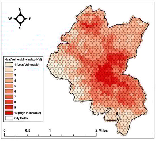 HVI was derived from the sum of all components, and the resultant index map can be seen in Figure 10, where the accumulation of high scores shows that the city center is more vulnerable than rural areas. There may be several possible explanations for our result. The high number of elders and those living alone are concentrated in the city center. Meanwhile, there is a lack of awareness about extreme events and a high poverty rate in suburbs compared to the central area. Moreover, when asphalt is exposed to the sun, pavements start to soften, which can lead to delays and some roads being closed for traffic. This makes the city center more vulnerable to heat stress and poor-air-quality events. The agricultural land also has a high tendency to capture heat due to bare soil and harvesting grains, which causes an increase in HVI during extreme heat days of summer.