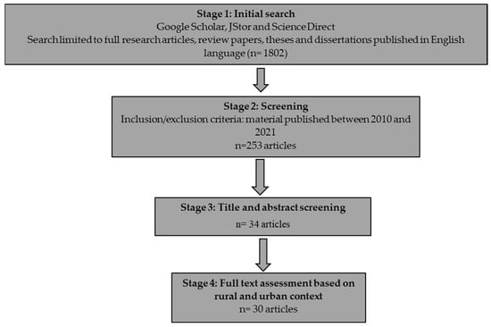 An initial search in Google Scholar, JStor, and Science Direct that used the search terms “vulnerability to climate change in South Africa”, “vulnerability to climate change in rural areas in South Africa”, and “vulnerability to climate change of urban areas in South Africa” yielded a total of 1802 articles. These articles were further screened using a custom range time frame from 2010 to 2021. Only 253 articles were retained. Title and abstract screening were conducted where articles with search terms “vulnerability to climate change in South Africa” in the title and abstract were selected. Only 34 articles were retained. As a final step, an assessment of full-text articles was conducted. Articles were screened based on whether they addressed the key theme of the review, the vulnerability of either rural or urban areas to climate change in South Africa. Only 30 articles were retained for the final review. Figure 1 summarises the article screening process.