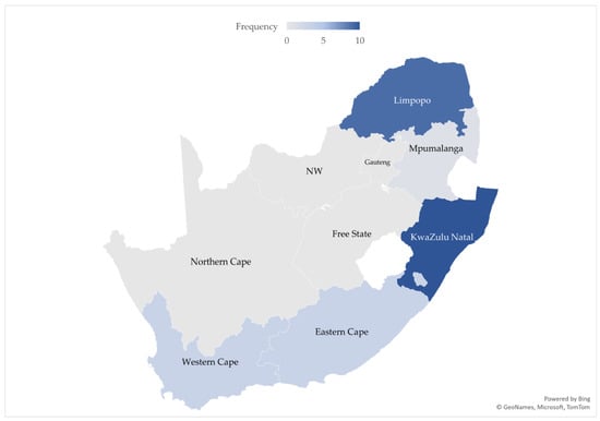 Table 1 presents the breakdown of literature sources included in the final review according to type, category, and province. Literature sources included in the review were full primary research articles, review papers, and theses related to the vulnerability of rural and urban areas to climate change in South Africa. Some literature sources assessed vulnerability to climate change for either rural or urban areas, while others assessed vulnerability in both settings. Studies reviewed included five of South Africa’s nine provinces, namely Limpopo, Mpumalanga, KwaZulu-Natal, Eastern Cape, and Western Cape. These provinces were in line with the definition of the rural and urban setting in South Africa. Hence, they were appropriate for the study. In some cases, one study assessed vulnerability in two or more provinces. A few assessed the vulnerability to climate change at the national level.