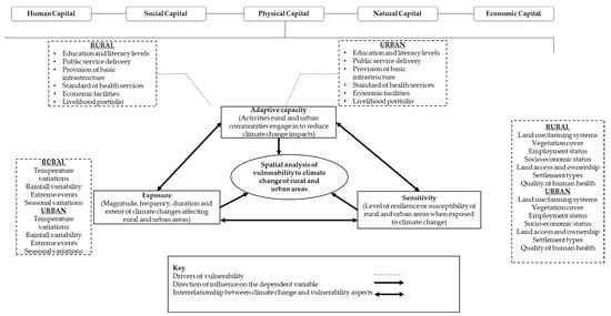 To holistically understand the differences in climate change vulnerability, the three aspects of vulnerability (exposure, sensitivity, and adaptive capacity) must be captured within the Sustainable Livelihood Approach. The Sustainable Livelihood Approach encompasses five pillars or livelihood assets: human, social, physical, natural, and economic capital. The Sustainable Livelihood Approach or framework was used for this review to assess the cross-sectoral differences in vulnerability to climate change between the rural/urban ecosystems concerning the direct impact on human wellbeing. The presented conceptual framework enables a socio-economic analysis within vulnerability-to-climate-change spatial modelling. Further, the three aspects of vulnerability (exposure, sensitivity, and adaptive capacity) are mapped, taking account of their indicators or drivers within the Sustainable Livelihood Approach.