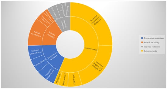 Regarding rainfall variability, the leading indicators for shifts in rainfall patterns identified in the review are rainfall variability, heavy rains, and changes in rainfall patterns. The review established that exposure to rainfall varies between the unit of analysis considered in different studies. Regarding the unit of analysis, farming households are largely exposed in rural areas. On the other hand, government sectors such as public health, water, and sanitation are highly exposed in urban areas. Our findings for rural areas align with the evidence in several research studies across Africa, especially in sub-Saharan Africa (SSA), on limiting factors for agricultural growth. For example, in Ethiopia, rainfall variability was a limiting factor in the uptake of agricultural credit [28]. This situation implies that farming households will continually be exposed to rainfall variability without the necessary means (capital) to reduce exposure.