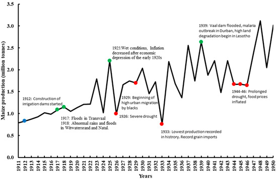 | 1932–1933 | Drought | Neutral b | Crop production declined except for wheat; half of the livestock died [63]; Record import of maize in South Africa [70] |