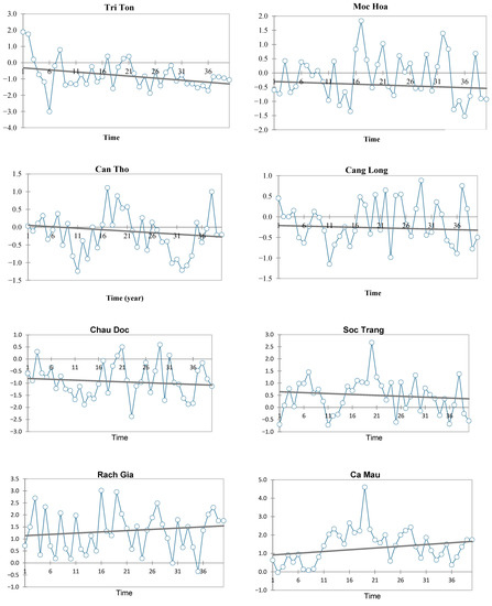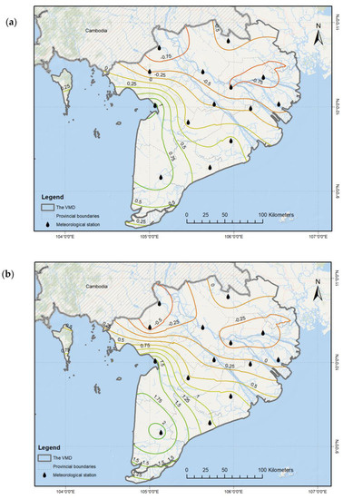 The results of the temporal analysis using the SPI 12−month drought data over the VMD are shown in Figure 2. The Mann–Kendall test showed that although the severity of the drought tended to decrease at coastal stations, with the exception of Soc Trang station, the trend was not statistically significant. Meanwhile, interior meteorological stations showed reduced rainfall, suggesting that the degree of drought is increasing. Among the stations (Tri Ton, Moc Hoa, Can Tho, Cang Long, and Chau Doc), only Tri Ton station showed an increased drought trend at the computed p-value, lower than the significant level alpha = 0.05.