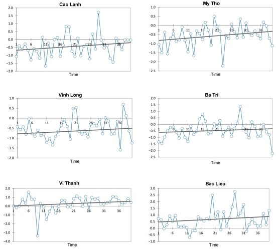 Compared with SPI 6 and SPI 9, SPI 3 highlighted more variation and susceptibility to extremes (too dry or too humid) (Figure A1). Figure 3, Figure 4 and Figure 5 display the findings of a cluster analysis for the three consecutive periods of 3 months, 6 months, and 9 months. According to the cluster analysis results, there were the same number of clusters and stations in each cluster for the 3, 6, and 9-month drought periods (SPI 3, SPI 6, and SPI 9). These were Cluster 1 (Ca Mau), Cluster 2 (Bac Lieu, Ba Tri, Cao Lanh, and Vinh Long), and Cluster 3 (Cang Long, Can Tho, Chau Doc, Moc Hoa, My Tho, Rach Gia, Soc Trang, Vi Thanh, Tri Ton). Cluster 1 has only one station, Ca Mau, which is the most unique station in the Mekong Delta, experiencing both extreme drought and extreme flooding. The drought severity in Cluster 2 tends to decrease, although this decrease is not statistically significant, according to the Mann–Kendall test results. Cluster 3 contains stations where the severity of drought fluctuates over time.