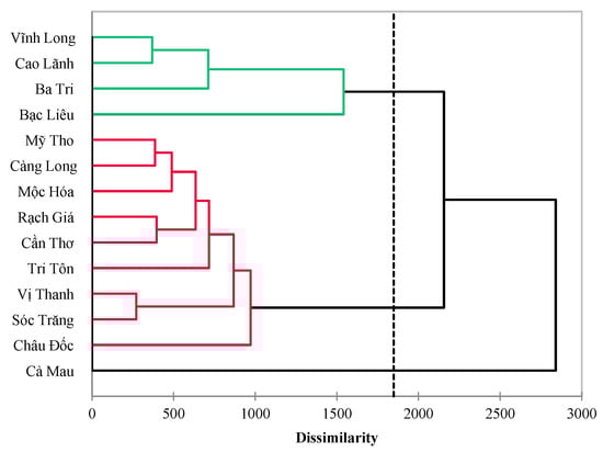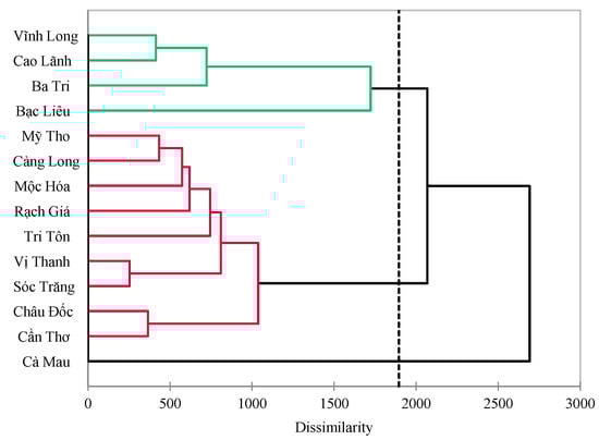 Agglomerative Hierarchical Clustering (AHC) is a common approach applied in many previous studies, using the squared Euclidean distance and Ward’s method [39,40,41]. This technique can group single objects into clusters with similarity based on certain criteria, making data simple and easy to comment on. The fourteen stations were grouped using hierarchical cluster analysis. As stations of similarity, Ward’s approach, employing squared Euclidean distances, was used [39]. The findings of the cluster analysis were interpreted using the dendrogram. The linkage distance, expressed as the dissimilarity level, was used to calculate the geographic variability of water quality using AHC. The connectivity distance shown on the x axis was then standardized by multiplying the quotient by 100 [39,40].