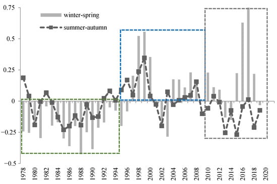 The seasonal mean SPI in the VMD shows that a slight to moderate drought occurred in both the summer–autumn and winter–spring rice cropping seasons during both 1978 and 1995. During the period from 1996–2008, our data show that most of the summer–autumn and winter–spring seasons were moderately wet periods. However, there was a partial drought in 2002 for both summer–autumn and winter–spring seasons. The period from 2009–2019 displays a clear difference between the summer–autumn and autumn–winter seasons; specifically, the winter–spring season was wet, while the summer–autumn season exhibited drought. These results also support Lien’s similar research [19].