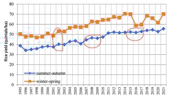 The arithmetic means of summer–autumn and winter–spring rice yields in the 13 provinces in the VMD.