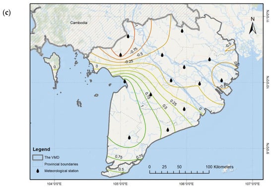 The isoline of average SPI 12−month drought in the VMD: (a) period 1978–1995; (b) period 1996–2008; and (c) period 2009–2019.