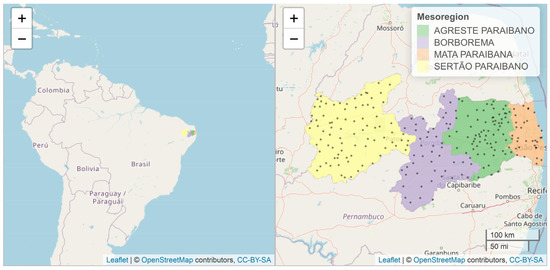 The study area corresponds to the State of Paraíba, located in the Northeast Region of Brazil, with a territorial extension of 56,467 km2, which corresponds to 0.664% of the entire territory of Brazil [17]. To obtain an idea of the extent of this region, countries on the European continent, such as Slovakia (48,845 km2), Denmark (43,094 km2) and Switzerland (41,290 km2) have areas smaller than the State of Paraíba. The state is divided into four mesoregions (Sertão Paraibano, Borborema, Agreste Paraibano and Mata Paraibana) with different climatic and environmental conditions (Figure 1).