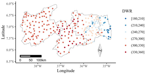 Figure 2 shows the spatial distribution of the average annual number of DWRs for the State of Paraíba from 1994 to 2020. As already described in Table 1, the Zona da Mata mesoregion presented the lowest average DWR, and most rainfall stations presented a maximum of 240 days without rain in the year. However, some rainfall stations located in the Borborema mesoregion showed the highest average DWR values, with at least 330 days a year without rainfall.