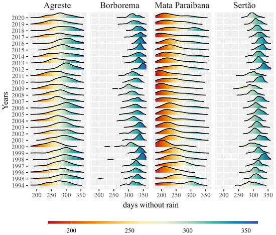 Density of the annual number of days without rain (DWR) for the Paraíba mesoregions from 1994 to 2020.