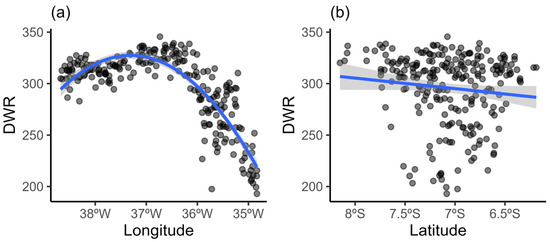 Figure 4 shows an exploratory analysis to investigate the relationship between the DWR variable and the geographic coordinates of longitude and latitude. We can clearly see a quadratic effect between DWR and longitude (Figure 4a). However, there is no causal relationship between the variable and latitude (Figure 4b).