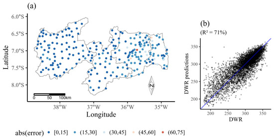 Figure 6 shows the result of the “leave-one-out” cross-validation when space–time kriging is applied to the number of days without rain in the year. Figure 6a shows that the mean absolute error varied between 0 and 75 days, and Agreste Paraibano had stations that presented the largest and the smallest errors, an expected result due to the high variability of the DWR between the rainfall stations located in this region. In Figure 6b, we have the scatter plot between the observed and estimated values by space–time kriging, in which we observed a good performance of the method, reaching a coefficient of determination of 71%.