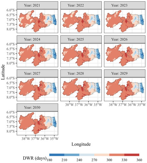 Figure 7 shows the results of the space–time kriging of the DWR from 2021 to 2030. The results indicate an increase in the number of dry days in the coming years in all mesoregions. As expected, the Borborema mesoregion is the one with the highest estimates, followed by the Sertão Paraibano.