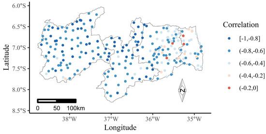 Spatial distribution of the Spearman correlation between the annual number of days without rain and the annual accumulated rainfall in the State of Paraíba.