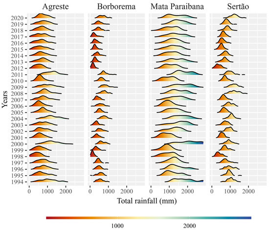 Density of the total annual rainfall for the Paraíba mesoregions from 1994 to 2020.