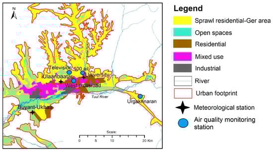 - Huang, Y.-K.; Luvsan, M.-E.; Gombojav, E.; Ochir, C.; Bulgan, J.; Chan, C.-C. Land use patterns and SO2 and NO2 pollution in Ulaanbaatar, Mongolia. Environ. Res. 2013, 124, 1–6. [Google Scholar] [CrossRef]
