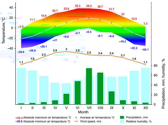 Ulaanbaatar’s climate and seasonal circulations are influenced by the topographic conditions around the city in the northeast mountain range of Mongolia [29] (Figure 1). A climate diagram can indicate the place’s seasonal regime of thermal, moisture, and wind. Figure 3 shows the climate diagram of Ulaanbaatar city as an average of three weather stations from 1991 to 2020.