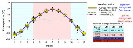 The Data Archive Division of the National Agency of Meteorology and Environmental Monitoring of Mongolia (NAMEM) provided surface meteorological and upper air data from 1991 to 2020 and air pollutants data from 2019 to 2020 for hourly and monthly timescales. To illustrate the temporal regimes of the meteorological parameters affecting air pollution, the hourly and monthly weather observation data were statistically processed. Because the weather parameters, especially temperature and wind, vary in the city center and surroundings according to geography, and urban patterns [41,42], three weather stations corresponding to different land use types were selected as the study locations: the University and Ulaanbaatar stations for the city center and the Buyant-Ukhaa station for the suburbs (Table 1, Figure 2). On the other hand, the stations are supposed to spatially represent differences in urban heat and cold islands as well as winds. For this reason, the average cold season air temperature map with a 0.0125° spatial resolution for Ulaanbaatar was plotted using the smoothing spline interpolation technique in ANUSPLIN statistical modeling developed by the Australian National University [43] of the Mongolia-wide climate data from 1991 to 2020.