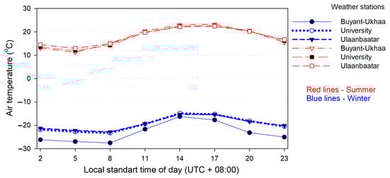 Although the air temperature is the lowest before sunset and the highest between 2 and 3 PM in any place and season for continental climate [37], the influence of the metropolitan city is also reflected—for example, artificial surface or urban materials affects the air temperature regime and lead to urban heat islands [41,42]. The biorhythm of city life is adapted to the diurnal and seasonal temperature regimes [51], and the heat distribution load increases during the heating season, affecting the city’s thermal regime and air pollution conditions [40].