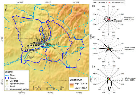 Windrose diagrams at Ulaanbaatar city’s weather stations in the winter: (a) Ulaanbaatar station, (b) University station, and (c) Buyant-Ukhaa station.